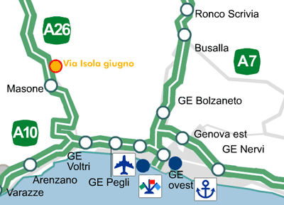 - Uscita Autostrada A26 Masone.Dopo il casello autostradale si incontra una rotonda: svoltare a sinistra direzione Campo Ligure.
